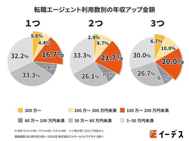 また、利用サービス数別に年収アップした金額を比較してみると、複数の転職エージェントを併用したほうが、100万円以上の大幅な年収アップ成功率が高い傾向が見られました。