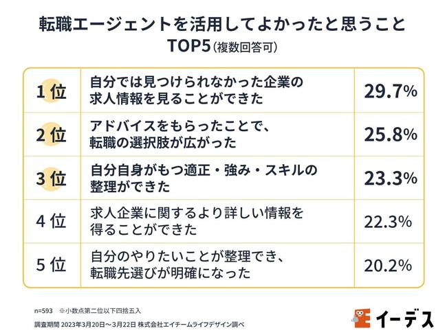 転職エージェント利用者がよかったと思うポイントは、1位「自分では見つけられなかった企業の求人情報を見ることができた」(29.7%)、2位「自分自身がもつ適性・強み・スキルの整理ができた」(23.3%)、3位「アドバイスをもらったことで、転職の選択肢が広がった」(25.8%)