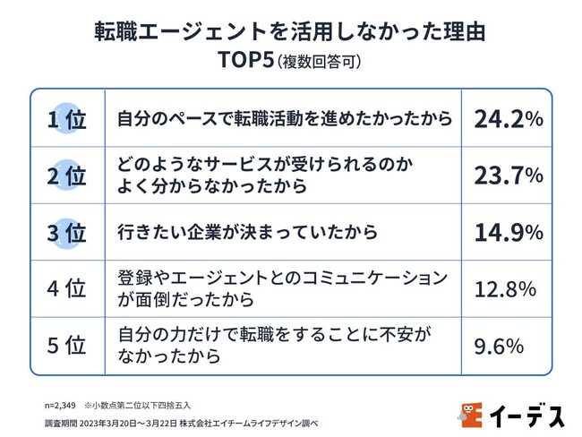 転職エージェントを利用しなかった理由に「どのようなサービスが受けられるのかよく分からなかったから」が多い(23.7%)