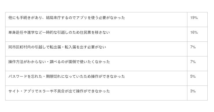 また「操作方法が難しい」「アプリやサイトでエラーが発生した」「パスワードを忘れた」といった、アプリ・サイトの問題や、「同市区町村内の引越し」といった条件面での問題も多数挙がっていました。