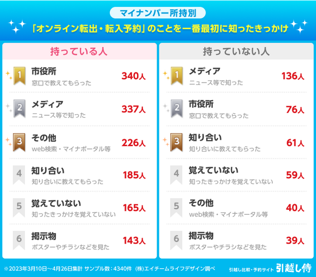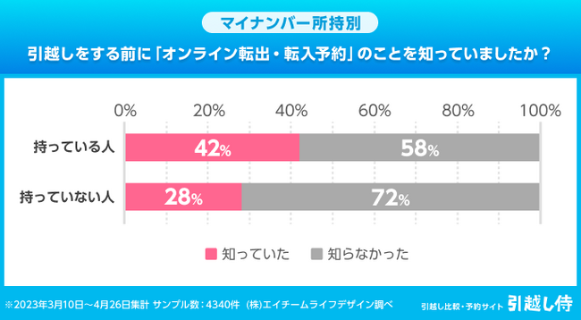 株式会社エイチームのグループ会社である株式会社エイチームライフデザイン(本社:愛知県名古屋市、代表取締役:間瀬文雄)は、同社が運営する引っ越しの見積もり比較サイト『引越し侍』の利用者に対して「マイナポータルを利用したオンライン転出・転入予約の利用」に関するアンケートを実施しました。(https://hikkoshizamurai.jp/report/report-20230516/)