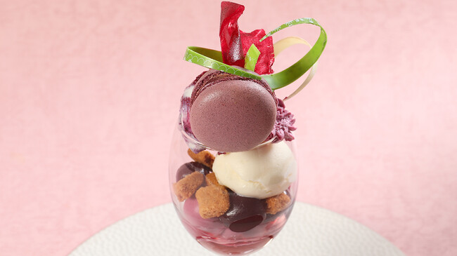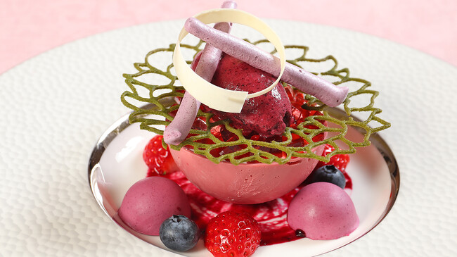 2品のうちからお好きな方を選んでいただくメインデザート「パフェバイオレット」「グリオットチェリーとショコラスフェール」などパティシエの趣向を凝らしたメニューの数々を地上100mの眺望とともにお楽しみいただけます。