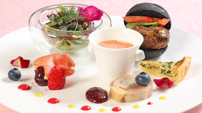 カシス・ブルーベリー・赤ブドウなどの果実をメインとする鮮やかな紫で彩られたスイーツプレートを始めとし、「エゾシカのミニハンバーガー」「生ハムフルーツのコラボ」など目でも楽しめるセイボリープレート、