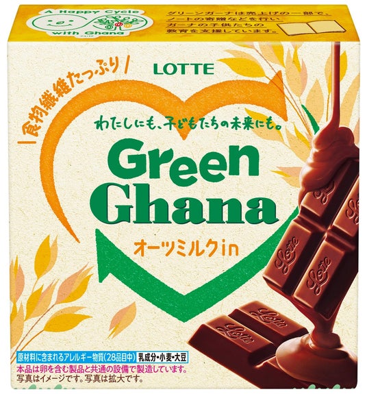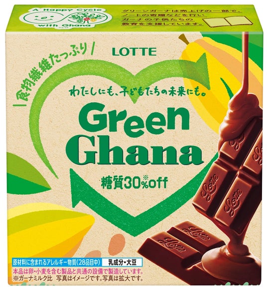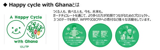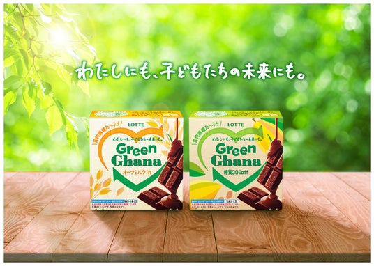 今回コンセプトを「わたしにも、こともたちの未来にも。」に変更しています。この背景には、「子どもたちがこれからも笑顔でチョコレートを食べ続けられる未来にしていきたい。」という思いを込めています。また、現在「ガーナ」で行っている「A Happy Cycle with Ghana」という社会貢献の取り組みの一つとして、グリーンガーナの売り上げの一部で、ガーナ共和国の子どもたちに教材(ノート)を寄贈する取り組みを実施いたします。