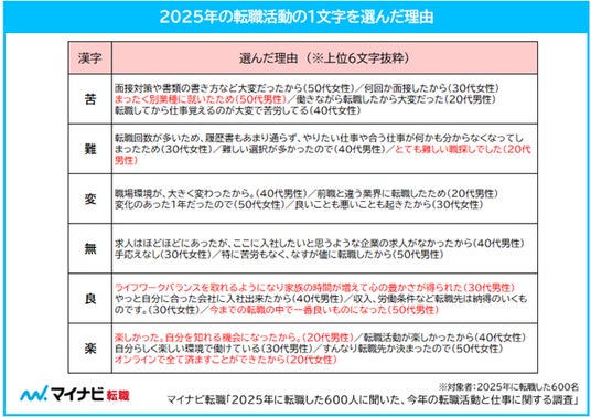 漢字選択の理由を見ると、「苦」では「面接対策や書類の書き方など大変だったから(50代)」「働きながら転職したから大変だった(20代)」などの回答が見られたほか、「まったく別業種についたため(50代)」など新しい分野に挑戦している様子も見られた。