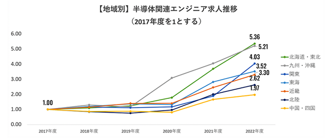 2020年以降は新型コロナウイルス感染症流行の影響で全世界的に在宅勤務へのシフトが進んだことで、PC、スマートフォン、サーバーなどの通信・ネットワーク機器の需要が急増しました。また、地政学リスクへの関心が高まり、半導体関連工場の国内回帰が進んだことも求人需要の押し上げ要因となっています。これらに加えて、2021年から現在にかけては、EV(電気自動車)化、カーボンニュートラル化への移行が本格的に進み、「半導体関連エンジニア」人材のニーズはさらに高まっています。特に「北海道・東北」「九州・沖縄」地域の伸びは大きくそれぞれ2017年度比較5.36倍、5.21倍となっています。