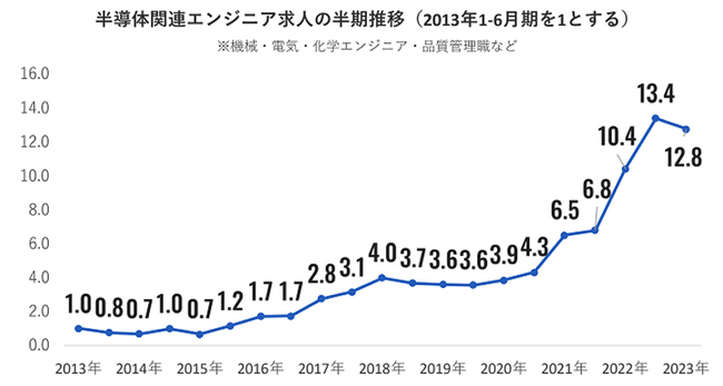 『リクルートエージェント』における「半導体関連エンジニア」求人の推移を見ると、2013年1-6月期を1として、2023年1-6月期は12.8倍と大きく伸長しています。2013年から2015年にかけて求人はほぼ横ばいで推移していましたが、2016年以降、各産業でIoT化が本格的に進み、求人の増加ペースが加速しました。その後、2018年の米中貿易摩擦や2020年1-6月期の新型コロナウイルス感染症流行により一時的に求人は停滞しましたが、2020年7-12月期以降、求人が大幅に増加しています。