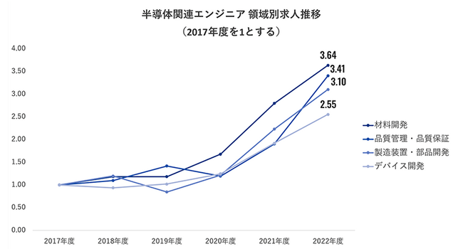 「半導体関連エンジニア」求人を「デバイス開発」「製造装置・部品開発」「材料開発」「品質管理・品質保証」の4つの領域別に見ると、「材料開発」「品質管理・品質保証」「製造装置・部品開発」が2017年度に比べ、いずれも3倍以上に増加しています。特に「品質管理・品質保証」は2021年度から2022年度にかけて急激な伸びを見せており、ニーズが高まっている様子がうかがえます。