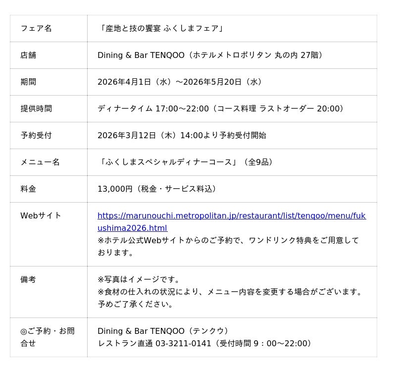 ホテルメトロポリタン 丸の内(所在地/千代田区丸の内、総支配人/桃谷健志)のダイニング&バー「テンクウ」では、JRグループ6社と福島県等が開催する「ふくしまデスティネーションキャンペーン(2026年4月~6月)」に連動し、4月1日から5月20日まで「ふくしまフェア」を開催いたします。