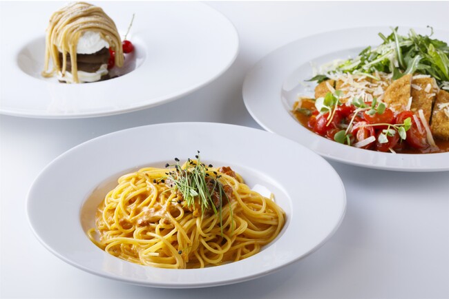 落合シェフ自ら、“ありそうでなかったメニュー”を次々に考案。平日はお好みでメニューが選べるプリフィクスコースをご用意。「ラ・ベットラ」の名物“ウニのクリームスパゲッティ”は、パスタに昆布出汁を吸わせることで、麺そのものに旨味をプラスし「昆布出汁香る新江戸ウニのクリームスパゲッティ」(要追加料金)に進化。