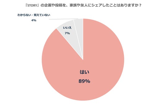 「『STORY』の企画や投稿を、家族や友人にシェアしたことがある」と89%の方が回答しており、また、85%が「『STORY』の発信内容や世界観に共感しますか?」に対して、「とても共感する」「やや共感する」と回答しています。