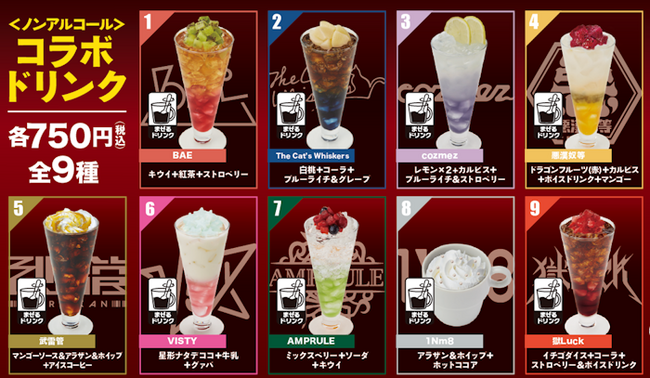 コラボドリンクは、「Paradox Live」の各グループ「BAE」「The Cat’s Whiskers」「cozmez」「悪漢奴等」「武雷管」「VISTY」「AMPRULE」「1Nm8」「獄Luck」をイメージした全9種【各750円(税込)】をご用意します。さらに、コラボフード「Paradox Liveスナックラップ(オリジナルランチョンマット付)」【880円(税込)】もご用意!注文特典として、オリジナルノベルティ【全60種:第1弾ポストカード29種/第2弾コースター31種】の中から、コラボドリンク・コラボフード1品ご注文につき1枚プレゼント!さらに、コラボフード「Paradox Liveスナックラップ」には、ランチョンマット【全2種:第1弾1種/第2弾1種】もついてきます。