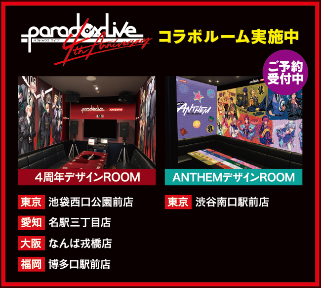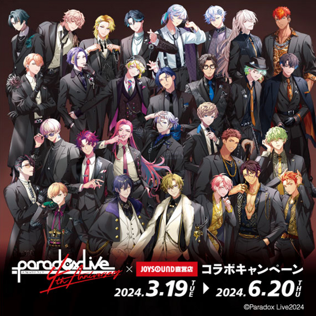 株式会社エクシングの子会社で、全国にカラオケ店舗を展開する株式会社スタンダード(本社:東京都港区、代表取締役社長:米田洋一)は、2024年3月19日(火)から2024年6月20日(木)までの期間中、「Paradox Live 4th Anniversary×JOYSOUND直営店コラボキャンペーン」と題し、JOYSOUND池袋西口公園前店・渋谷南口駅前店(東京)・名駅三丁目店(愛知)・なんば戎橋店(大阪)・博多口駅前店(福岡)の5店舗にカラオケコラボルームをオープン!また、JOYSOUND直営店全店舗にて、オリジナルノベルティ付きコラボメニューを展開します。