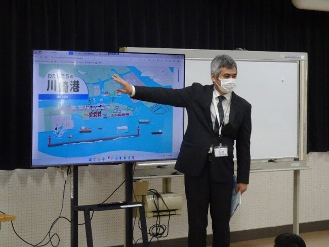 今回参加したのは5年生で、この学年では社会科で貿易を学びます。それに合わせて見学ツアー前の12月6日(水)に、川崎市港湾局の職員が住吉小学校で川崎港の貿易について紹介しました。その際には、川崎みなと祭実行委員会で作成した市内小学生向けデジタル副読本「わたしたちの川崎港」を活用しました。