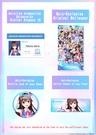 受験を申し込んだ方全員に、「ホロライブプロダクション大学 デジタル学生証」をプレゼントします。さらに、受験した人全員が「受験記念オリジナル壁紙」「SNSアイコン」「受験記念Twitterヘッダー」をダウンロードできます。なお、「ホロライブプロダクション大学 デジタル学生証」「SNSアイコン」「受験記念Twitterヘッダー」はお好きなタレントをお選びいただけます。