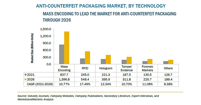 偽造防止パッケージの市場規模は、2021年の1,172億米ドルからCAGR12.5%で成長し、2026年には2,113億米ドルに達すると予測されています。同市場は、偽造の削減のため、メーカーがブランド保護に注力していることから、高い成長が見込まれています。