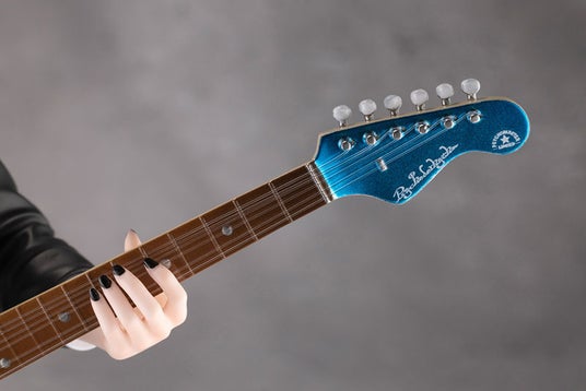 ギターは桃香愛用のモデルを、フィギュアでも再現!印象的な「中指立ててけ!」の文字にも注目です。