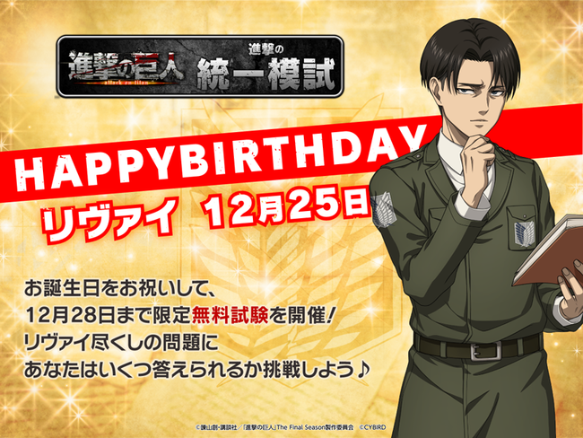 株式会社サイバード(本社:東京都渋谷区、代表取締役社長 兼 CEO 本島 匡、以下「サイバード」)が実施しているTVアニメ『進撃の巨人』の公式テスト「進撃の統一模試」において、「リヴァイ誕生日記念コース」を、2022年12月25日(日)0時から3日間、無料で開催します。