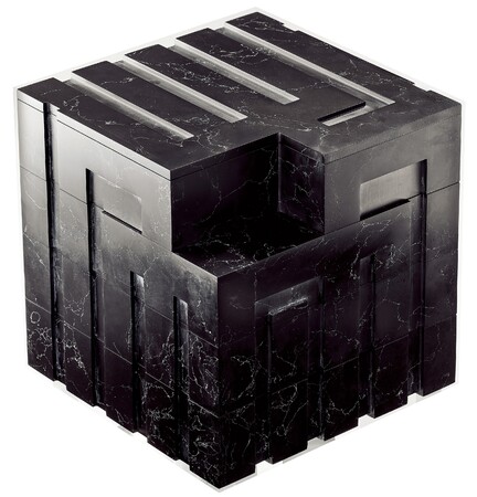 銀座並木通りの日本料理店〈六雁〉。おせちを彩る新作の器にもこだわりを持ち、源氏物語五十四帖のうち「桐壺」と「夢の浮橋」を除いた52の図柄で構成される「源氏香 の図」をモチーフにした〈六雁〉のデザインを具現化したのは、〈日の出 工芸〉(代表取締役 三輪 昌博氏)。詳細なCAD データを作成し、大理石のような重厚感のある素材を0.1mm単位の精緻な加工で削り出し、秋山氏の想い描くイメージを見事に表現しています。この美しい意匠に盛り込まれたのは、源氏物語五十四帖にちなんで用意された、54種類にもおよぶ圧巻の美味。黒豆や大豆などの福豆とドライフルーツを田作りのように仕上げたスペ シャリテの“福豆のかりんとう”をはじめ、まるで 源氏物語絵巻さながらの世界で、私たちを目でも舌でも喜ばせてくれます。