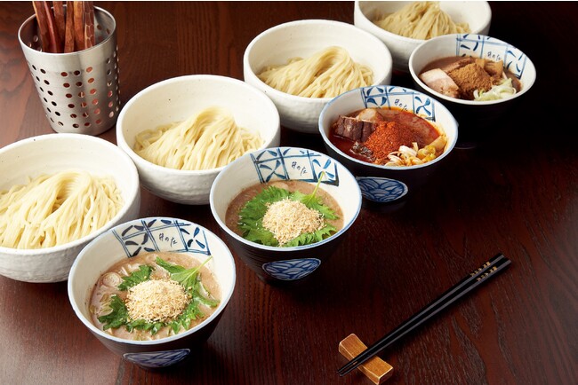 「2021年お取り寄せラーメン・オブ・ザ・イヤー つけ麺大賞」を受賞した3種(つけ麺、辛々魚つけ麺、ホタテの塩つけ麺×2)のつけめんをセットに。