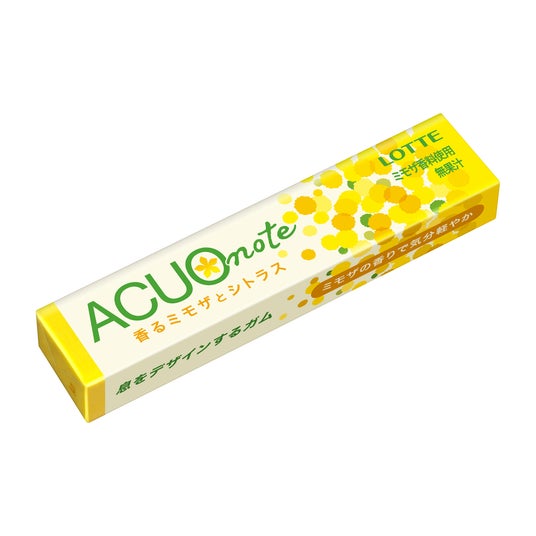 そこで息をデザインするガムACUOから、香りが広がり、息だけではなく気持ちもスッキリと切り替えてくれる「ACUO note」を開発しました。今回採用した「ミモザ」の香りは人気が高まっている香りの1つで、さわやかで透明感のあるグリーンフローラルが特徴です。香りが強すぎず親しみやすいスッキリした香りですので、ACUOブランドのイメージともピッタリです。パッケージデザインは、ACUOのデザインフォーマットを踏襲しながら、新しさと香りの広がりを感じるデザインに仕立てています。