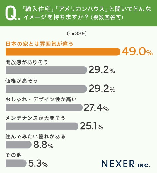 ■「輸入住宅」「アメリカンハウス」のイメージ、最多は「日本の家とは雰囲気が違う」で49.0%