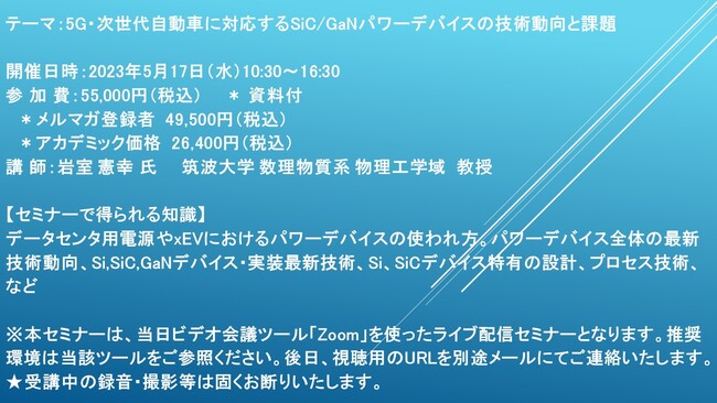 先端技術情報や市場情報を提供している(株)シーエムシー・リサーチ(千代田区神田錦町: https://cmcre.com/ )では、 各種材料・化学品などの市場動向・技術動向のセミナーや書籍発行を行っておりますが、 このたび「5G・次世代自動車に対応するSiC/GaNパワーデバイスの技術動向と課題」と題するセミナーを、 講師に岩室 憲幸 氏 (筑波大学 数理物質系 物理工学域 教授)をお迎えし、2023年5月17日(水)10:30より、 ZOOMを利用したライブ配信で開催いたします。 受講料は、 一般:55,000円(税込)、 弊社メルマガ会員:49,500円(税込)、 アカデミック価格は26,400円(税込)となっております(資料付)。