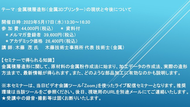 先端技術情報や市場情報を提供している(株)シーエムシー・リサーチ(千代田区神田錦町: https://cmcre.com/ )では、 各種材料・化学品などの市場動向・技術動向のセミナーや書籍発行を行っておりますが、 このたび「金属積層造形(金属3Dプリンター)の現状と今後について」と題するセミナーを、 講師に木藤 茂 氏 (木藤技術士事務所 代表 技術士(金属))をお迎えし、2023年5月17日(水)13:30より、 ZOOMを利用したライブ配信で開催いたします。 受講料は、 一般:44,000円(税込)、 弊社メルマガ会員:39,600円(税込)、 アカデミック価格は26,400円(税込)となっております(資料付)。