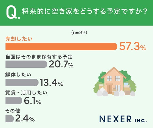 その結果「売却したい」が57.3%と過半数を占め、最も多い回答となりました。次いで「当面はそのまま保有する予定」が20.7%、「解体したい」が13.4%、「賃貸・活用したい」が6.1%となっています。
