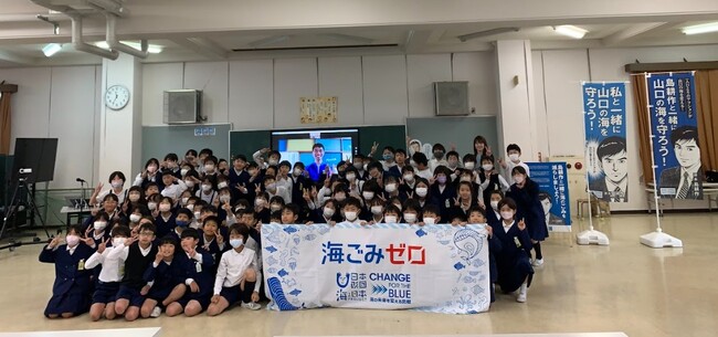 「一般社団法人 山口・海ごみゼロ維新プロジェクト」は2023年12月19日(火)に、山口市立小郡南小学校で、海のごみについて学ぶ特別授業を開催いたしました。海岸に漂着するごみを誰でも捨てることができる「拾い箱」を考案した鹿児島・与論島の池田龍介さんを講師に、4年生の児童約100人が、リモート授業に臨みました。
