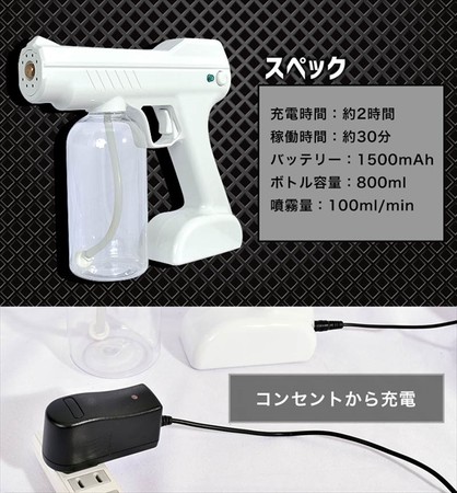 噴霧量は無段階調整で最大100ml/分。800mlのボトル付きです。