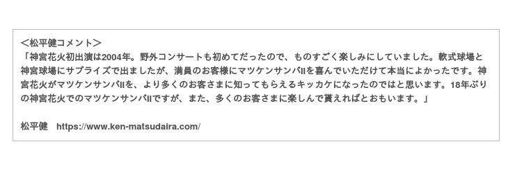 そして、出演者第3弾として発表するのは、神宮球場出演の松平健と、神宮軟式球場出演のLDH所属のHIPHOPグループ・DOBERMAN INFINITY。松平は2019年の「神宮外苑花火大会」に出演し、「マツケン・アスレチカ」を披露。会場を大いに盛り上げました。DOBERMAN INFINITYは「神宮外苑花火大会」初登場。8月5日からは本アルバム「4th ALBUM「LOST+FOUND」を引っ提げ、全国12カ所13公演の全国ツアー『DOBERMAN INFINITY LIVE TOUR 2022 “LOST+FOUND”』を行います。