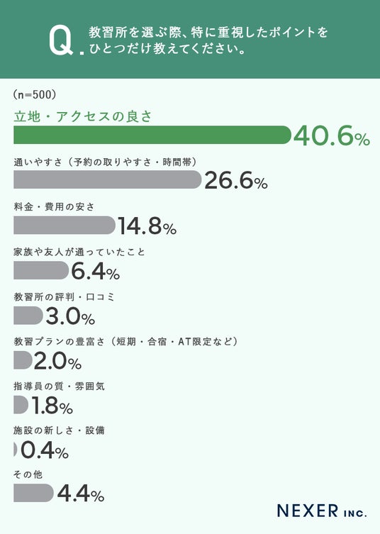 今回の調査では、教習所選びにおいて「立地・アクセスの良さ」が最重要視されていることが明らかになりました。