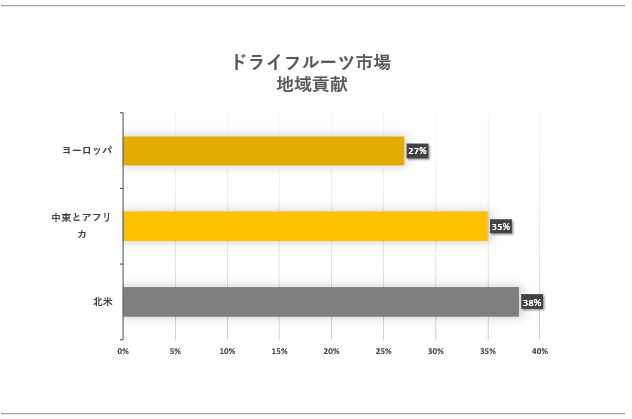 北米地域 のドライフルーツ市場は、CAGR7.8%と堅調に成長しています。2020年、米国はドライフルーツ市場を226百万米ドルで輸出しました。また、ドライフルーツは米国で509番目に輸出された製品となっています。主な輸出先は、カナダ3770万ドル、日本3230万ドル、メキシコ1960万ドル、ドイツ1610万ドル、中国1290万ドルです。プルーンの場合、最大の生産国はやはり米国(43%)です。報告によると、米国における一人当たりのプルーンの消費量は約 0.24 ポンドに達しました。ナツメヤシは、ドライ フルーツの 1 人あたりの消費量が最も多いものの 1 つでもあります。