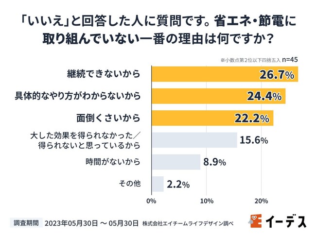 一方で、省エネ・節電に取り組まない人が抱える一番の理由は、低得点の人は「具体的なやり方がわからないから」(37.0%)で、高得点の人は「継続することができないから」(26.7%)という意見もあり、実際に自分の生活に落とし込むことが難しいと考えている方も一定数いることがわかりました。