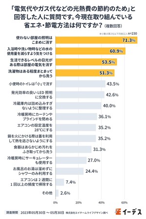 その他、半数以上が「入浴時や洗い物時などの水の使用量を減らす」ことや、「生活できるレベルの日光がある際は部屋の電気を消す」ことを実践していることがわかりました。