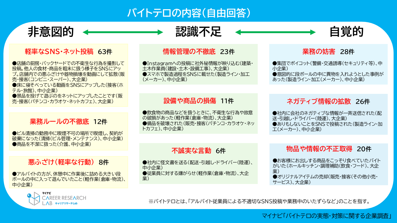 発生した「バイトテロ」の内容を自由回答で聞くと、「軽率なSNS・ネット投稿」や「悪ふざけ」などの従業員側としては非意図的な行為から、「情報管理の不徹底」など認識不足によるもの、さらに「ネガティブ情報の拡散」など自覚的な行為まで幅広い事例が確認された。