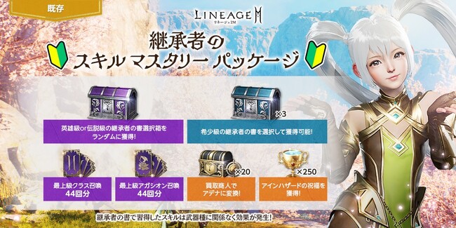 期間中、新規または復帰された継承者様限定で購入ができる「継承者のスキル マスタリー パッケージ」が登場しました。クラスとアガシオンの最上級召喚44回分や、「ハイネスの伝説級継承者の書挑戦箱(刻印)」1個、「ハイネスの希少級継承者の書選択箱(刻印)」3個などがセットになっています。