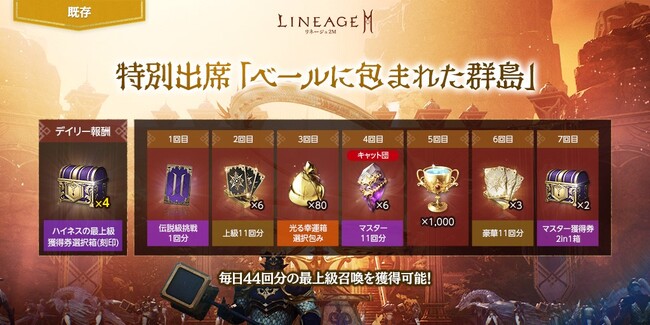 「群島戦闘支援」では、デイリー報酬として、「アインハザードの祝福」9,000のほか、「名誉の勲章」30,000個や、「上級クラス/アガシオン獲得券(11回)(イベント)」「上級覚醒のポーション(刻印)」などのアイテムを獲得することができます。