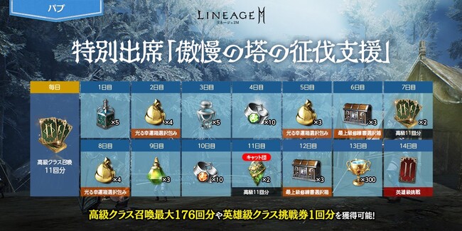 期間中、毎日達成していくデイリー ミッションと2週間でクリアを目指すシーズン ミッションで構成された、新規シーズンパス「パプリオンの傲慢征伐」が登場します。デイリー ミッション、シーズン ミッションをそれぞれ達成してシーズンパスEXPを獲得し、パス レベルを上昇させることで、「ピュアエリクサー(刻印)」や「成長のポーション(10%)(イベント)」や、イベントアイテム「パプリオンの傲慢征伐箱(イベント)」など、様々なアイテムを報酬として獲得することができます。また、1,000,000アデナを使用することでプレミアム報酬を有効化することができます。最終報酬として、「アインハザードの祝福」12,000を獲得することが可能です。