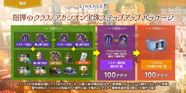 「ハイネスの宝珠箱(刻印)」50個に、クラスまたはアガシオンのマスター召喚11回分と最上級召喚66回分、「上級覚醒のポーション(刻印)」10個、「ハイネスの祝福された製作の証(刻印)」1個などがセットになった「指揮のクラス/アガシオン宝珠ステップアップ パッケージ」が登場しました。