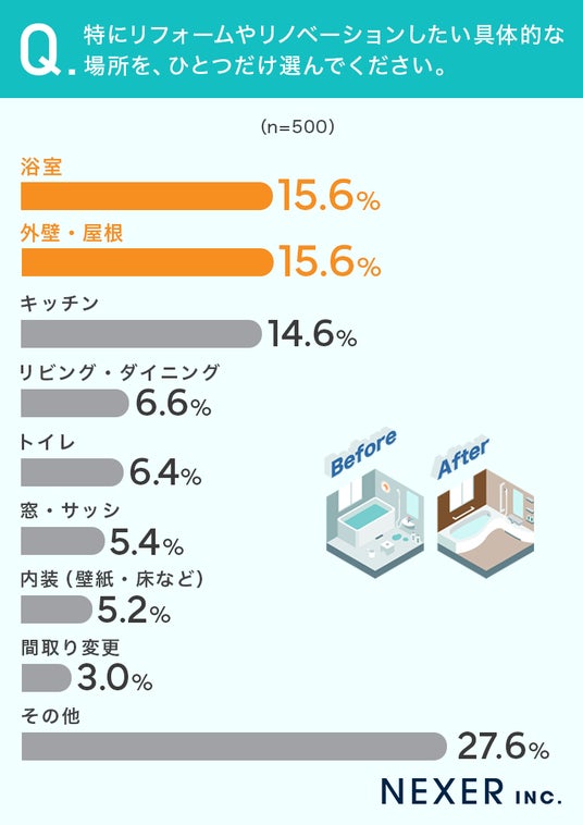 ■「浴室」「外壁・屋根」がともに15.6%で最多。リフォームしたい場所のリアル