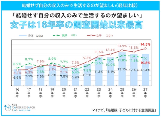 結婚の希望については、「結婚せず自分の収入のみで生活するのが望ましい」とした学生が、男子10.8%(前年比0.8pt減)、女子14.5%(前年比1.2pt増)で、女子は16年卒の調査開始以来最高を更新した。【図1、2】