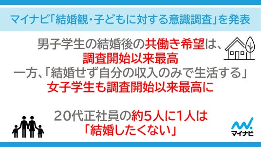 男子学生の結婚後の共働き希望は、調査開始以来最高。一方、「結婚せず自分の収入のみで生活する」女子学生も調査開始以来最高に。20代正社員の約5人に1人は「結婚したくない」、30代では約3人に1人
