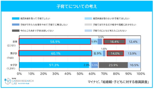 学生の子育てに関する考えを聞いたところ、最も多かった回答は前年同様「育児休業を取って子育てしたい」(58.9%)となり、将来の子育てに前向きな姿勢が引き続き高い結果となった。男女別でみると、「育児休業を取って子育てしたい」と答えた男子学生が60.1%となり、調査開始以降初めて女子学生(57.3%)を上回った。 将来の育児参加への意欲が男性にも広がっていることがうかがえる。一方で、「今のところあまり子どもは欲しくない」と回答した学生は18.4%と一定数存在している。男子では14.0%(前年比1.4pt増)で、こちらも調査開始以来最も高い割合となっており、女子では23.9%(前年比0.2pt減)と約4人に1人が子どもは欲しくないと回答している。「子どもが欲しくない」と思う理由は、「うまく育てられる自信がない(51.8%/前年比9.0pt減)」が前年同様最多で、「子育てに伴う責任を負う自信がない(49.8%/前年比3.5pt増)」が続いた。【図3、4】
