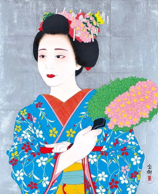 さまざまな高名な日本画家たちが「都をどり」の魅力を表現してきた歴代の作品とともに、令和6年から新たにポスターを手掛ける日本画家、諫山宝樹(いさやま たまじゅ)氏の原画もいち早くご紹介。東映京都撮影所での襖絵の制作や、連続テレビ小説「スカーレット」の絵付・日本画指導、八坂神社の新年干支大絵馬の奉納のほか、今年のNHK大河ドラマ「光る君へ」の衣装人物画も担当する気鋭の日本画家の原画作品を間近でご覧いただけます。
