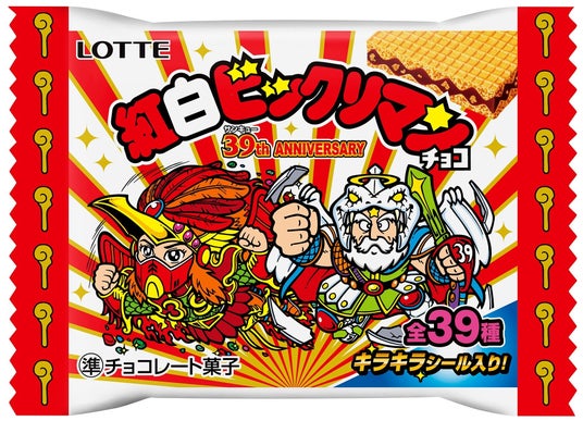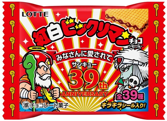 株式会社ロッテは2024年10月15日(火)、ビックリマン悪魔VS天使シリーズ39(サンキュー)周年記念商品第2弾として「紅白ビックリマンチョコ<39th ANNIVERSARY>」を発売いたします。本商品のシールは、懐かしさと新しさを同時に表現した「ニュートロ風」で、キラキラシール全39種です。パッケージはおめでたい紅白基調のデザイン2種類です。