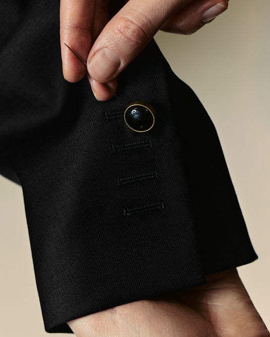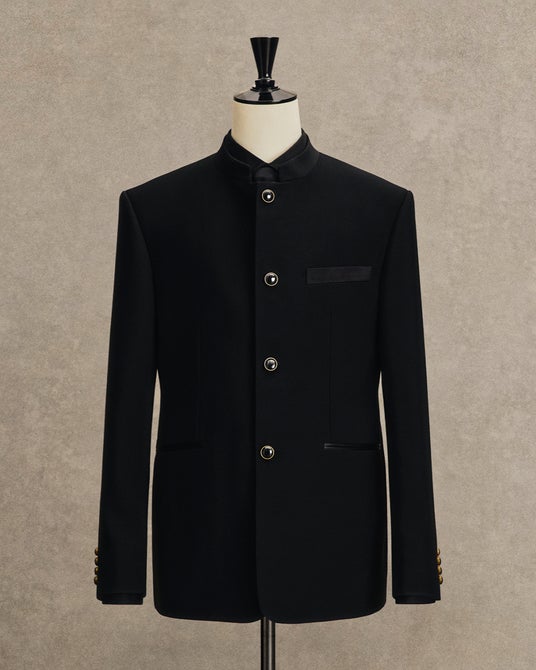 マイケル・B・ジョーダンが着用したブラックのオフィサーカラージャケットは、100%ウールで仕立てられ、エレガントなシルクサテンの胸ポケットとパイピングのディテールが特徴。また、ブラックとゴールドのロゴ入りボタンで装飾されています。