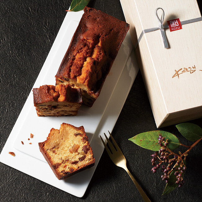 〈レストランKazu〉創業時より熟成したラム酒に漬け込んだフルーツを少しずつ継ぎ足しながら大切に育ててきました。そのフルーツをたっぷりと使用し、ブラウンシュガーのコクに 少しだけ香るシナモンがアクセントになっています。焼き上がりに更にラム酒をたっぷりと染み込ませた「大人のフルーツケーキ」は濃厚かつ芳醇な味わいでワインやブランデー、ウイスキーなどにもぴったりです。
