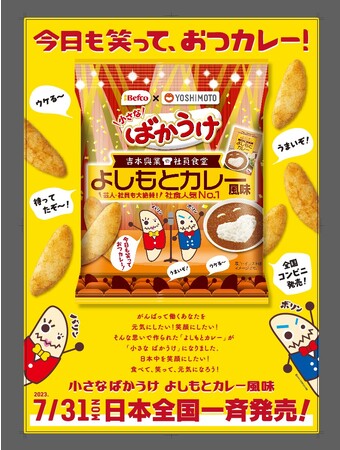 吉本興業の社員食堂人気NO.1のメニュー「よしもとカレー」と、 “ばかうけ”など多数の米菓を製造販売する(株)栗山米菓がコラボレーションした「小さなばかうけ よしもとカレー風味」が2023年7月31日(月)から、全国のコンビニエンスストア等で発売されます。